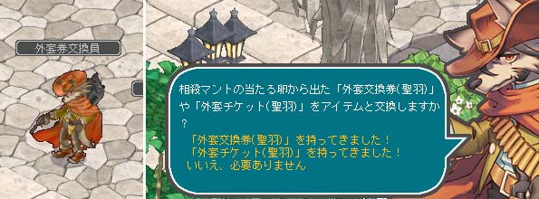 | 「外套の卵(聖羽)」を1個開封する毎に『外套チケット(聖羽)』を1枚獲得します。 チケットを集めてNPC「外套券交換員」に持っていくと様々なアイテムと交換できます。 ※トレード、バザー不可。 ※エクストラボックス保存不可。 |
