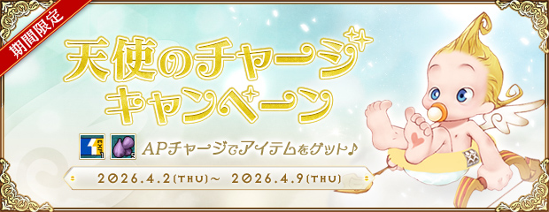 APにチャージすると「ペット経験2倍カード(1日)」1枚と「天使の種」5個と「ワンワンのおしり(30日)」と「祝福ポーション2026」50個を1度のみプレゼント!